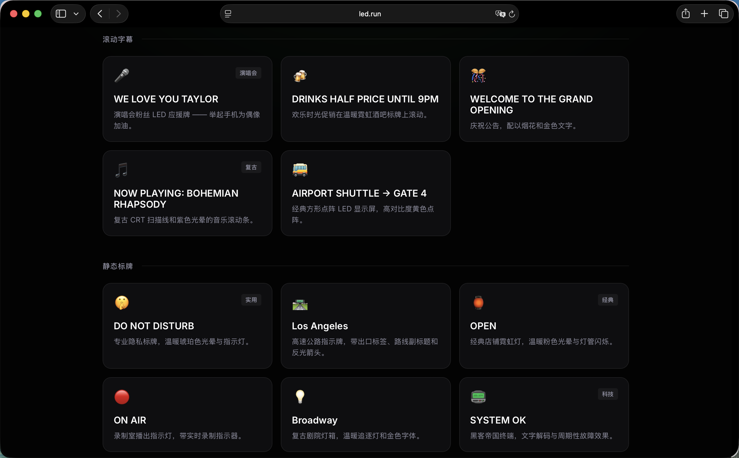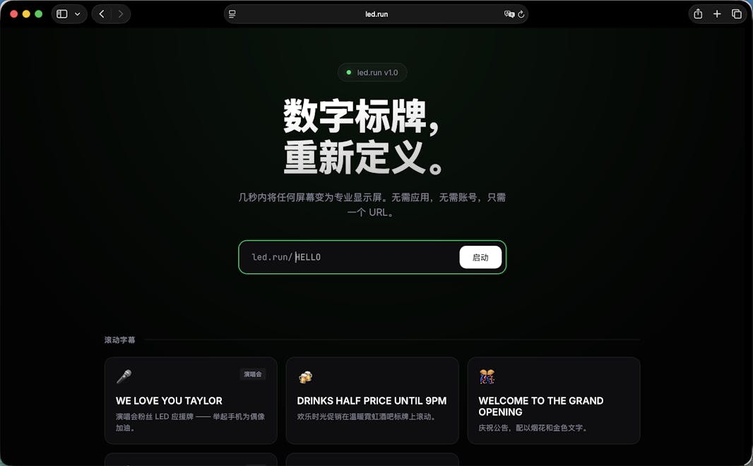 led.run - 周末做了一个即时数字标牌工具,几秒内把任何屏幕变成 LED 显示牌, URL 即标牌